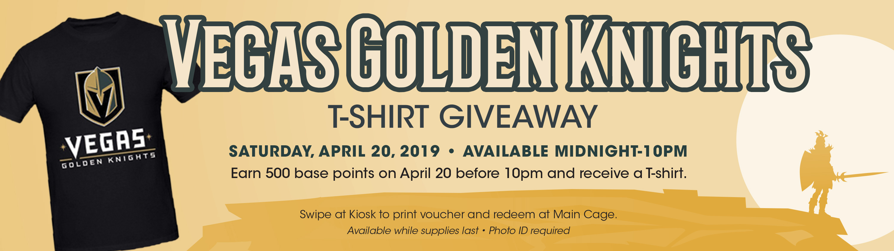Earn 500 base points on April 20 before 10pm and receive a Golden Knights T-Shirt while supplies last. Swipe at Kiosk to print voucher and redeem at Main Cage. Photo ID required.